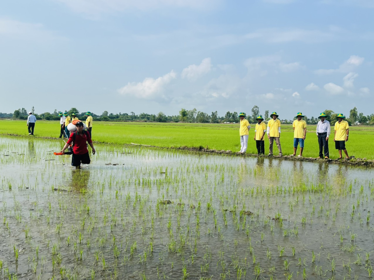 Ở thời điểm cây lúa hơn 10 ngày tuổi, mặc dù thời tiết đầu vụ nắng nóng nhưng những dịch hại như bọ trĩ hầu như không xuất hiện. Lí giải nguyên nhân này, anh Trần Hữu Nghĩa và bà con trong mô hình cho rằng, chính việc làm đất kỹ, bón lót đầu vụ bằng phân bón Đầu Trâu Mặn - Phèn, và xử lý hạt giống tốt ngay từ đầu, kết hợp sạ cụm chỉ 60kg/ha,… đã giúp cây lúa khỏe, lá lúa dày, cứng nên đã hạn chế bọ trĩ rất nhiều, so với các ruộng lúa vẫn gieo sạ theo phương thức truyền thống ở địa phương.